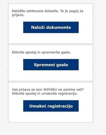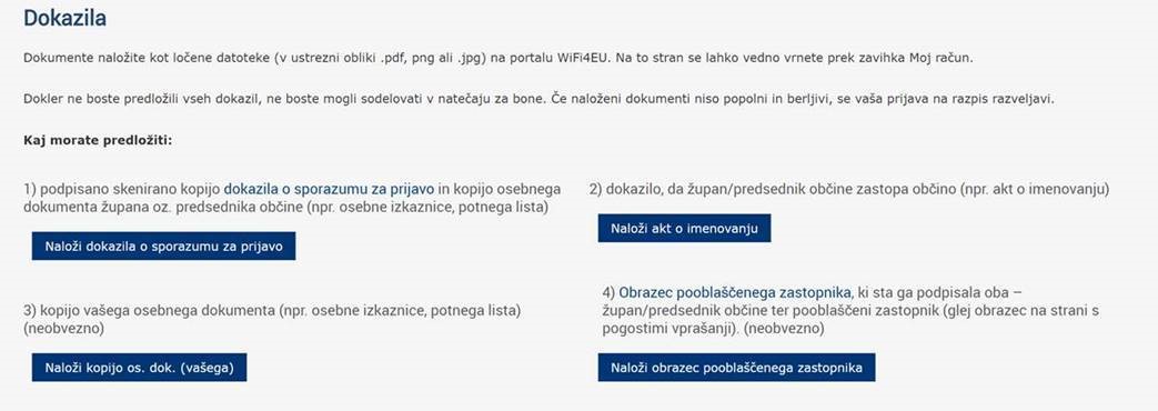 Vse občine, ki morajo ažurirati obstoječa dokazila in tiste, ki se še niso registrirale, pa bi želele sodelovati v WiFi4EU pobudi morajo, ko bo vzpostavljen nov WiFi4EU portal, za dokončanje registracije izvesti sledeče postopke, ki so potrebni za pridobitev možnosti sodelovanja v WiFi4EU pobudi (opomba: takšen je bil do sedaj postopek posredovanja dokazil, dopuščamo, da bo način dokončanja registracije na novem portalu nekoliko drugačen):