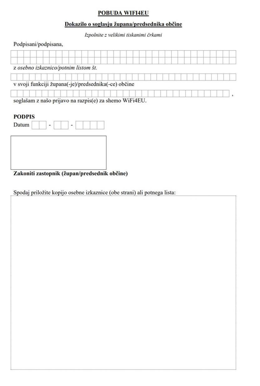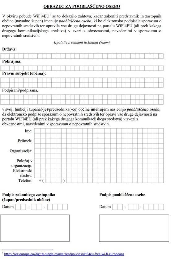 - Pod točko 4 kliknite na povezavo obrazec pooblaščenega zastopnika (obarvano modro, povezava https://ec.europa.eu/digital-single-market/en/news/wifi4eu-authorised-person-form):
