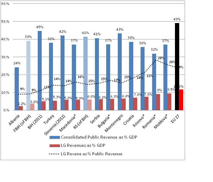 Stanje v drugih delih regije je težje oceniti. Lokalne oblasti v Turčiji, Sloveniji, RS (BiH), Srbiji, Črni gori in na Hrvaškem imajo prihodke med 5,3 in 7,0% BDP, kar predstavlja 14 – 18% javnih prihodkov in pomeni nizko stopnjo v primerjavi s standardi EU.