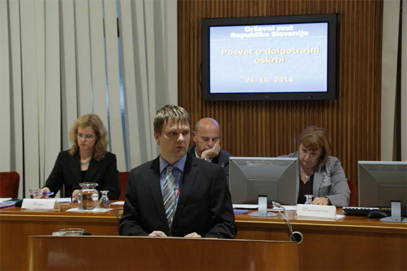 24.10.2016 se je predsednik Komisije za zdravstvo in socialo SOS, Andrej Sluga v imenu SOS udeležil strokovnega posveta na temo dolgotrajne oskrbe, ki so ga organizirali Državni svet, Ministrstvo za delo, družino, socialne zadeve in enake možnosti ter Ministrstvo za zdravje ob podpori Evropske komisije. Na posvetu so strokovnjaki drugi držav predstavili sistem dolgotrajne oskrbe in njihove izzive v državah članicah EU. V pozdravnem nagovoru so se udeleženci prav tako seznanili, da bo ureditev področja dolgotrajne oskrbe v pristojnosti Ministrstva za zdravje in da se na državni ravni aktivno pripravljajo sistemske rešitve. Predsednik Komisije SOS je opozoril na pomembnost vključitve oziroma upoštevanja pogleda lokalnih skupnosti na ureditev področja dolgotrajne oskrbe in na nujnost sistemskega reševanja. Pri tem je izpostavil ugotovitve iz zbirnega poročila Računskega sodišča o Pravilnosti poslovanja občin v delu, ki se nanaša na dodeljevanje tekočih transferov (Številka: 324-17/2015/4 z dne 24. 11. 2015), in sicer glede (ne)vpliva občin pri zagotavljanju in financiranju institucionalnega varstva. Da je pri tem potrebno upoštevati tudi, da se delež tekočih transferov za institucionalno varstvo odraslih na občinah ves čas povečuje. Tako se je znesek tekočih transferov za institucionalno varstvo odraslih v osemletnem obdobju (od leta 2007 do 2014) povečal za približno dvakrat. Samo za tekoče transfere t.i. družbenih dejavnosti občine namenijo več kot 30% vseh odhodkov. Prav tako pa je izpostavil, da je nujno potrebno upoštevati splošno finančno stanje v državah, s katerimi se Slovenija bo (je) primerjala glede ureditve dolgotrajne oskrbe. Upoštevajoč neizpodbitne demografske kazalnike občine v naslednjih letih z zakon določenih obveznosti ne bomo mogle več izpolnjevati, zato je nujen takojšen sprejem sistemskega financiranja dolgotrajne oskrbe, ki bo finančno vzdržen za lokalne skupnosti.