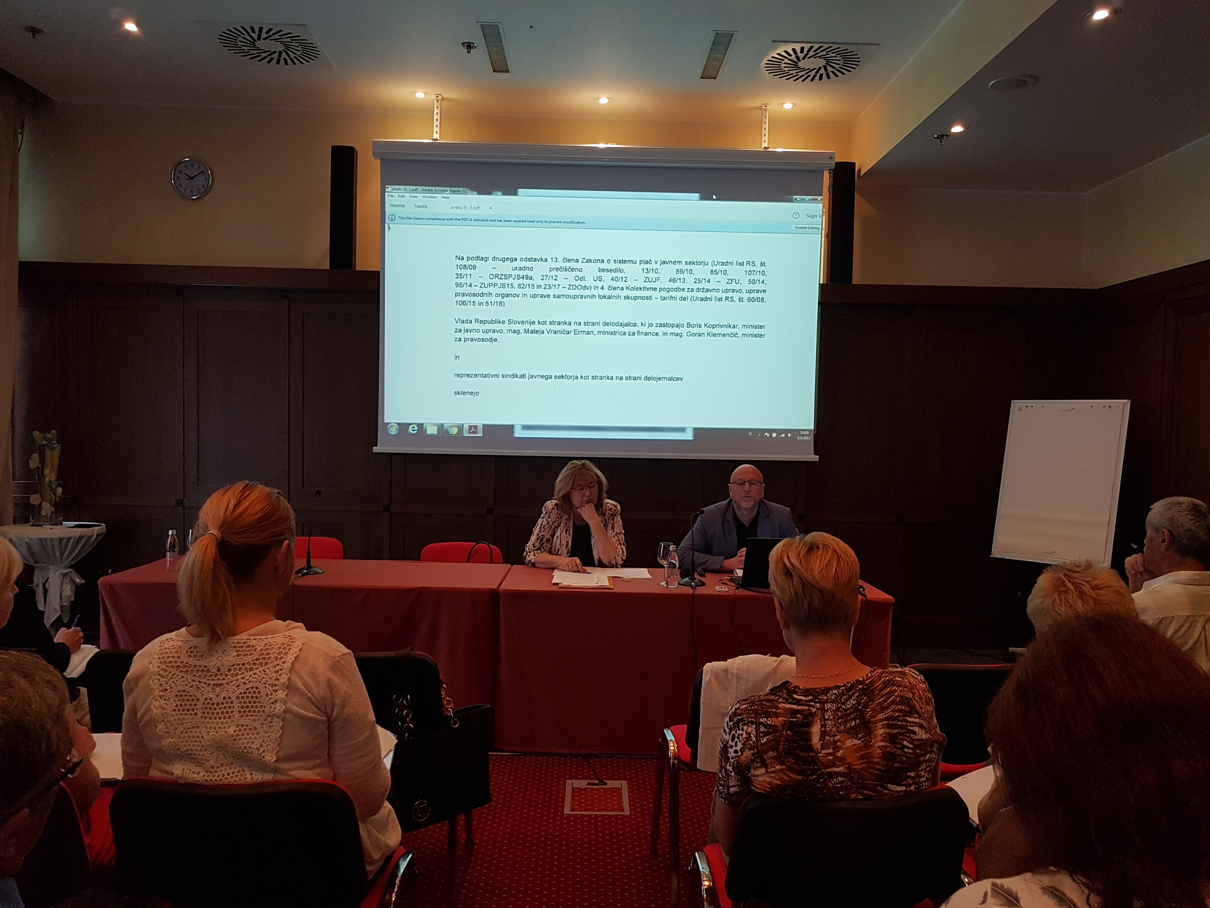 Seje predsedstva SOS sta se udeležila tudi minister za kulturo, Anton Peršak s sodelavcem g. Boštjanom Tadlom. Minister je izpostavil, da bo v prihodnjih nekaj letih namenjenih kar nekaj sredstev za razvoj področja kulture v občinah, tako na področju investicij, kulturnih vsebin kot tudi na področju kulturne dediščine. V pripravi pa je tudi t.i. zakon, ki bo uvedel » kulturni evro« oz. zakon, s katerim bodo omogočena vlaganja v umetniška dela. Novela Zakona o uresničevanju javnega interesa v kulturi predvideva 1,25-odstotni delež za likovna dela od naložb v prenove ali novogradnje v vrednosti do deset milijonov evrov in odstotek za naložbe nad tem zneskom. Ta delež bi veljal za javne investitorje, javnopravne osebe, ki jih obvezuje javno naročanje za novogradnje ali obnove nekaterih nepremičnin v javni lasti. Lokalne skupnosti so se sicer do zakona opredelile negativno, predvsem zaradi dodatnih stroškov ob investicijah, ob upoštevanju dejstva, da občine zagotavljajo sredstva za investicije bolj ali manj same – ali skozi privarčevana sredstva, zadolževanje, pridobivanje evropskih sredstev – država občinam, glede na stopnjo razvitosti zagotavlja sredstva za investicije v skladu z 21. in 23. členom Zakona o financiranju občin, vendar so ta sredstva že nekaj let, vse od krize znižana na raven, ki v marsikateri občini z nizko finančno kapaciteto, onemogoča uresničevanje potrebnih investicijskih posegov na številna področja, ki zahtevajo takšna vlaganja. Županje in župani, pa tudi minister Peršak, so v razpravi ugotavljali, da so sredstva, ki so v državnem proračunu zagotovljena za področje kulturnih investicij in kulturnih vsebin izjemno omejena, odstopanje sredstev države v primerjavi z vlaganji lokalnih skupnosti na tem področju pa zaskrbljujoče. Izrazili so podporo prizadevanjem za zagotovitev dodatnih sredstev za področje kulture, vendar pod pogojem, da se najprej zagotovi financiranje občin v skladu z veljavno zakonodajo, zaradi česar bo v prihodnosti možno dodatno zvišati občinska vlaganja na področju kulture. Opozorili so tudi, da je potrebno tudi pri zakonodaji, ki jo pripravlja Ministrstvo za kulturo, pripraviti vse predloge zakonov tako, da bodo vsebovali oceno finančnih posledic za lokalne skupnosti.