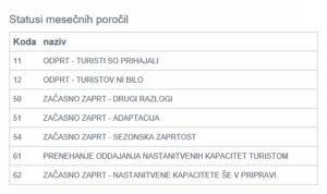 V mesečnih poročilih najdete v tretjem zavihku “Register nastanitvenih obratov” med zadnjimi stolpci (z drsnikom desno do konca) sklop podatkov Mesečne statistike za pretekli mesec. Sklop teh podatkov se začne s stolpcem “Status”, kjer so vpisane številke – šifre z naslednjim pomenom: